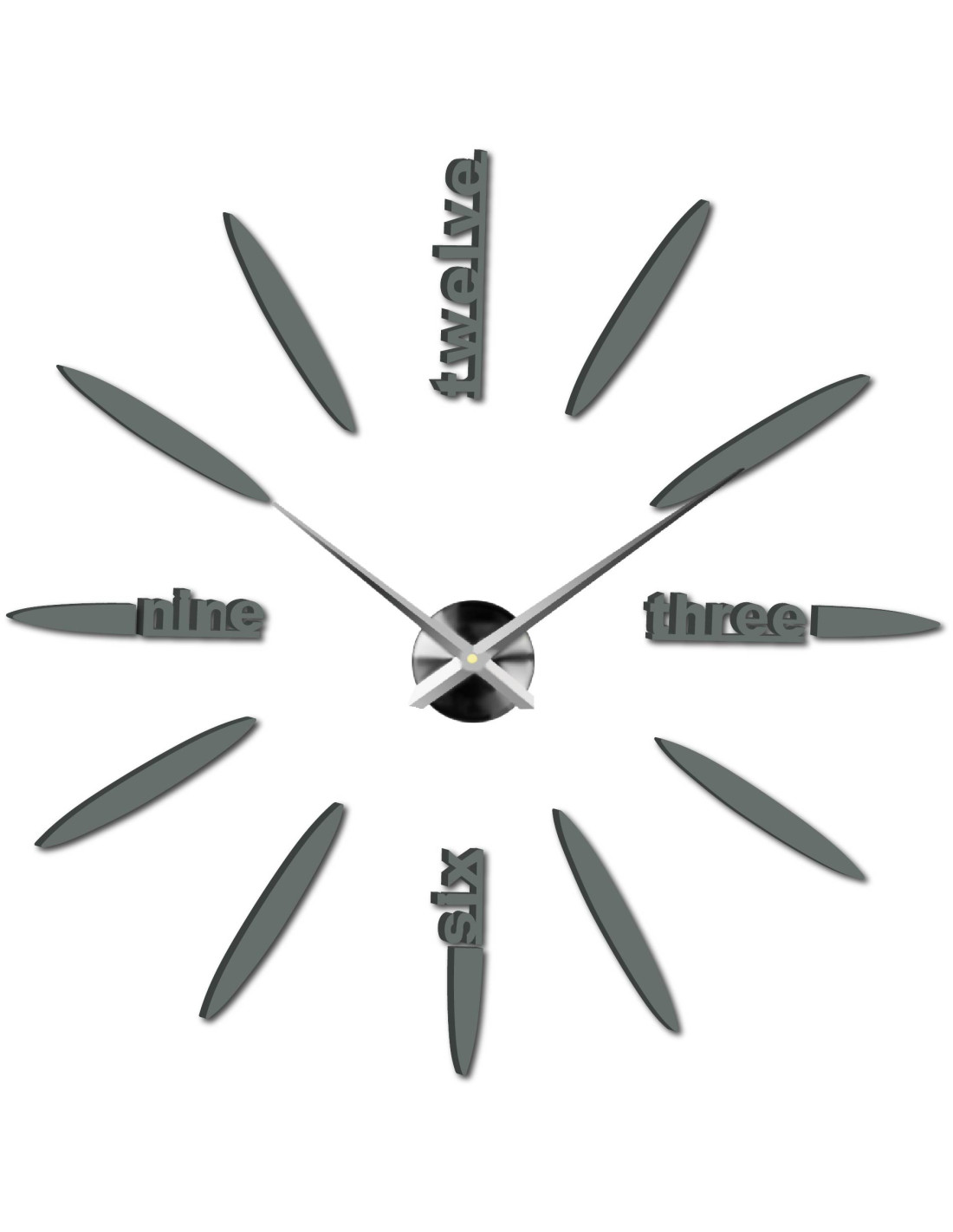 Číselné označení hlavních bodů ciferníku je nahrazeno slovy, čímž vzniká zajímavý vizuální kontrast.