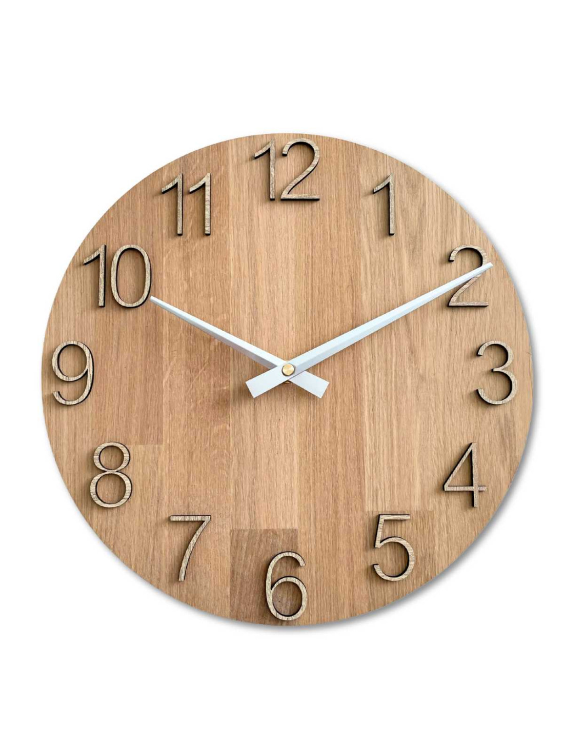 Hodiny vyrobené z dřevěného masivu s gravírovanými čísly a přírodním vzorem.
