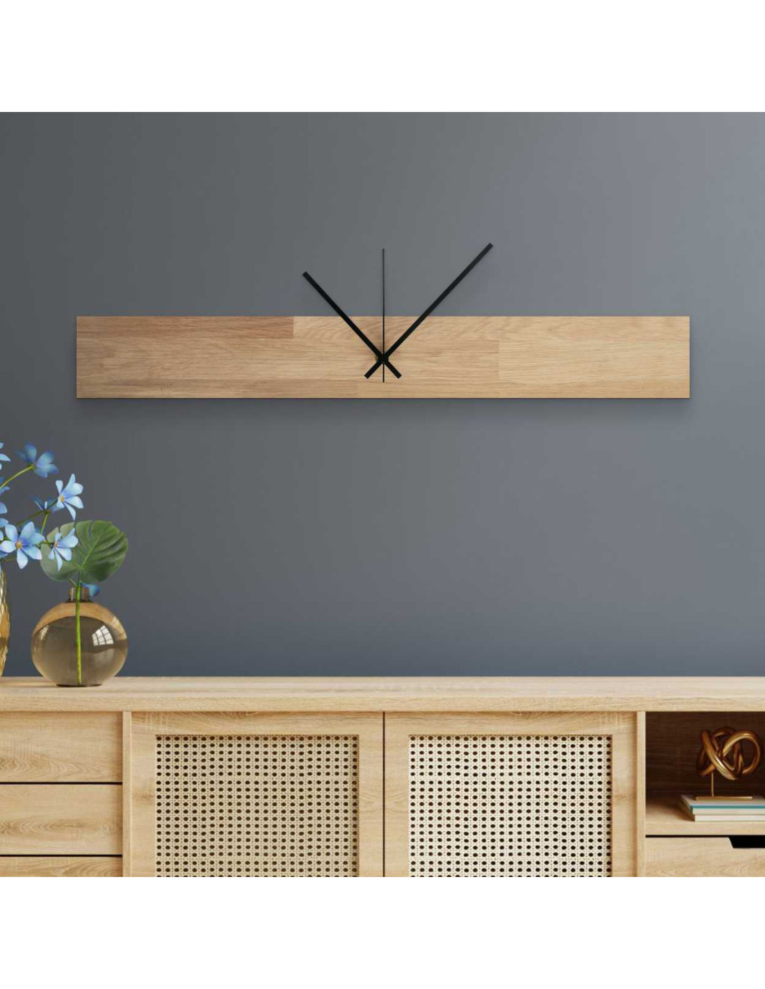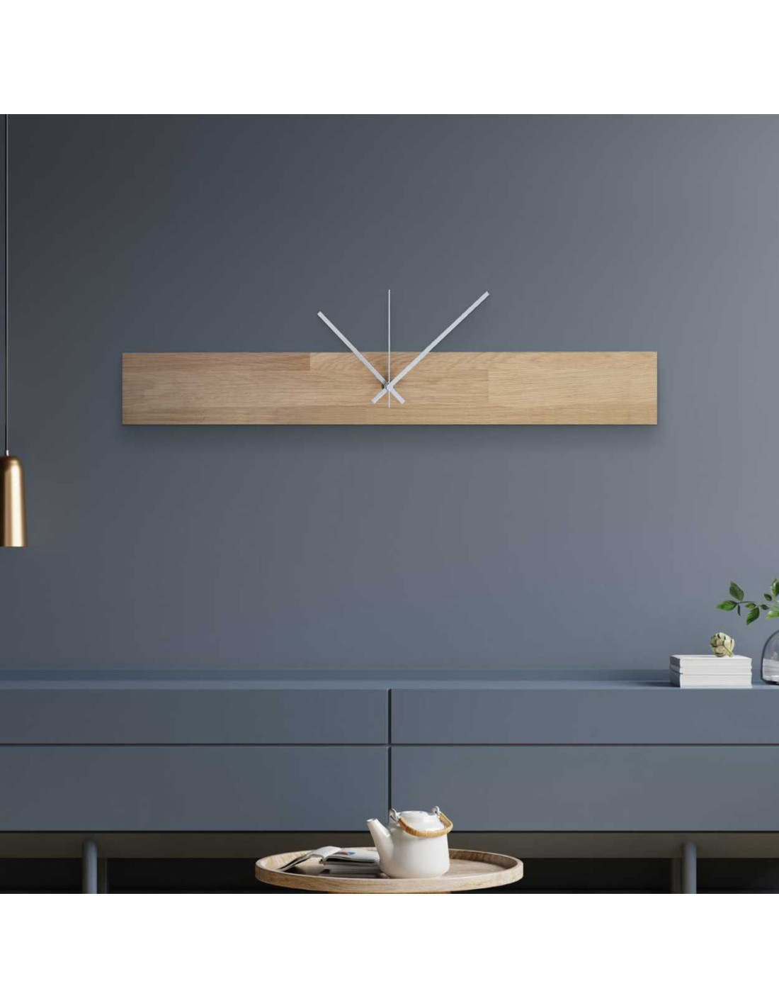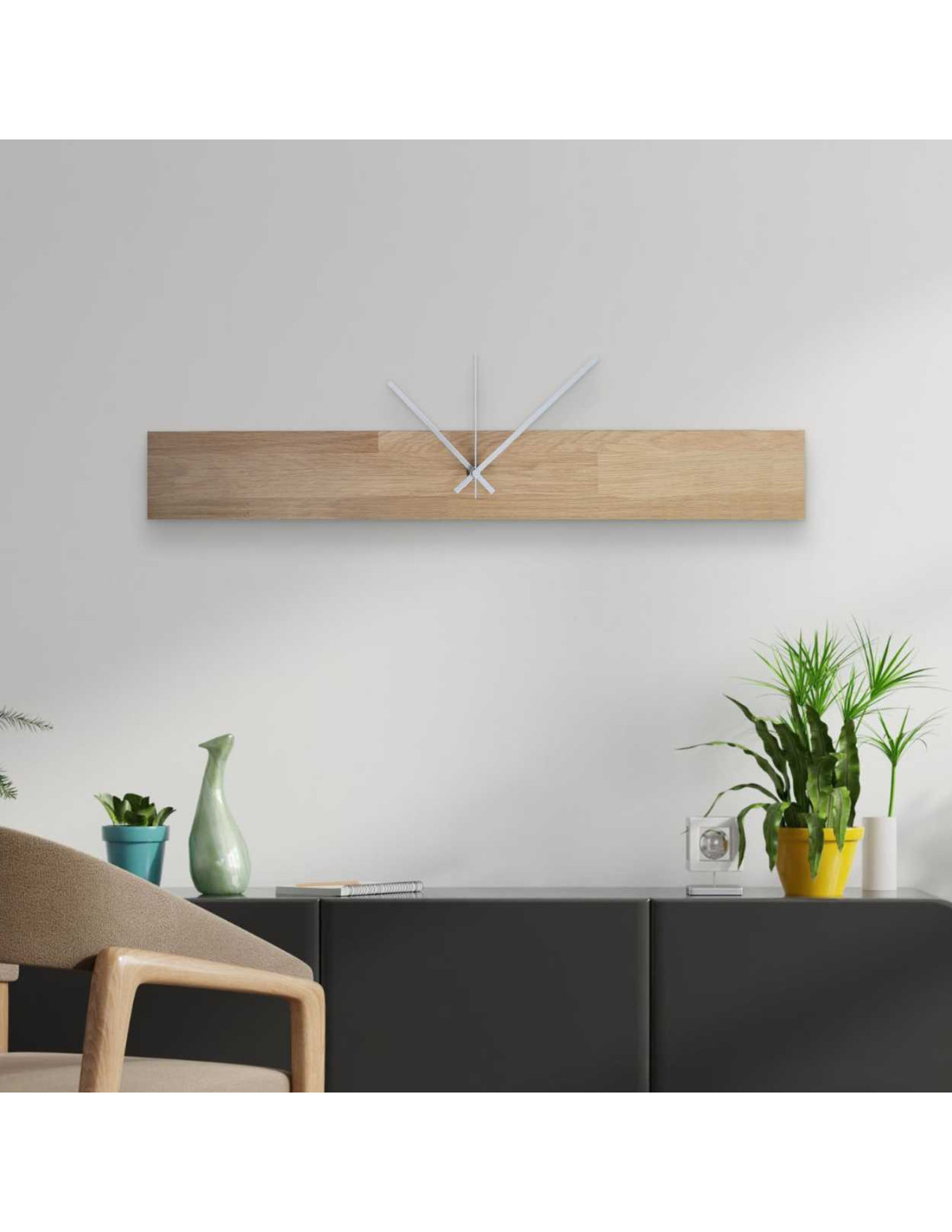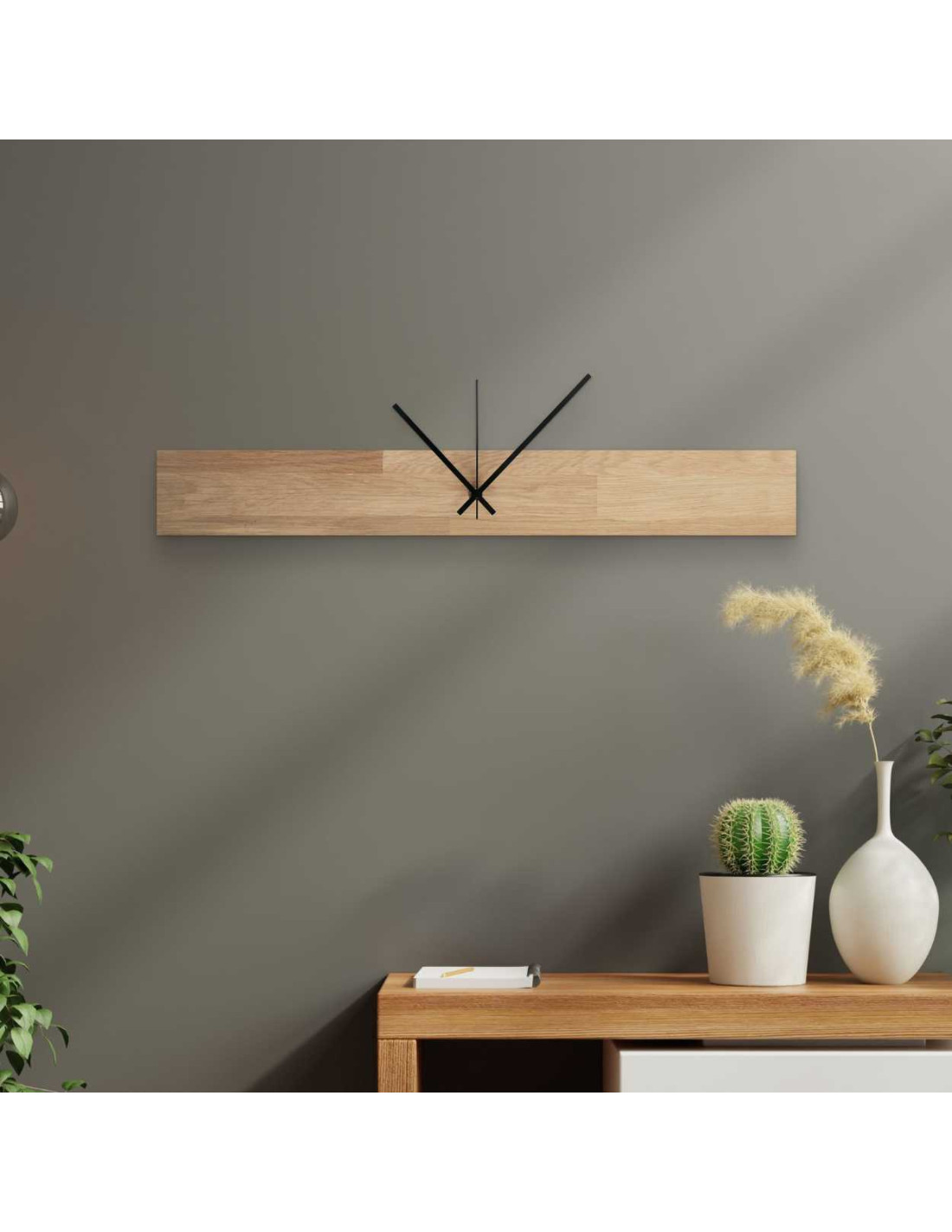 Dřevěné nástěnné hodiny v minimalistickém stylu dodají prostoru pocit harmonie a vkusu.