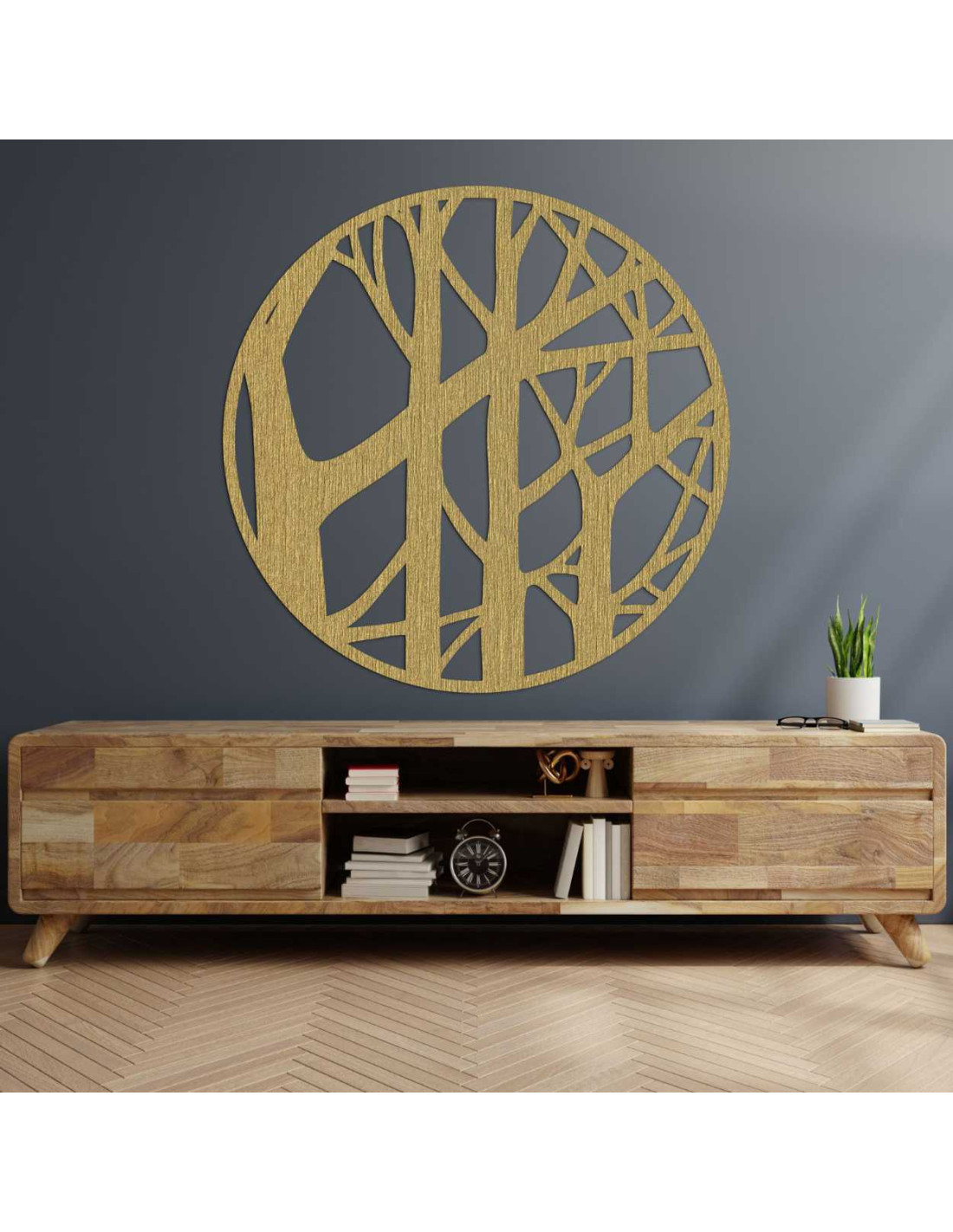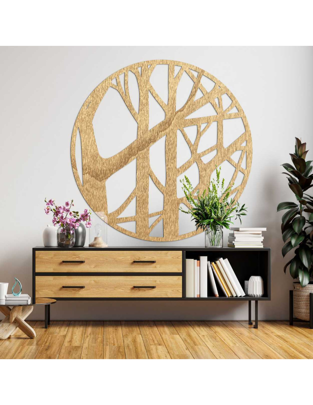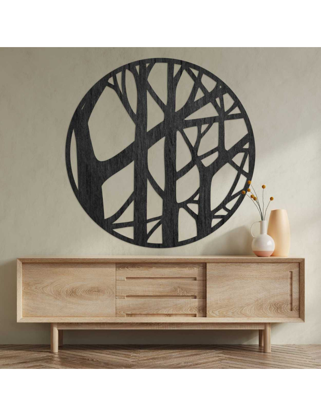 Kruhová ozdoba ze dřeva zavěšená nad dřevěnou komodou