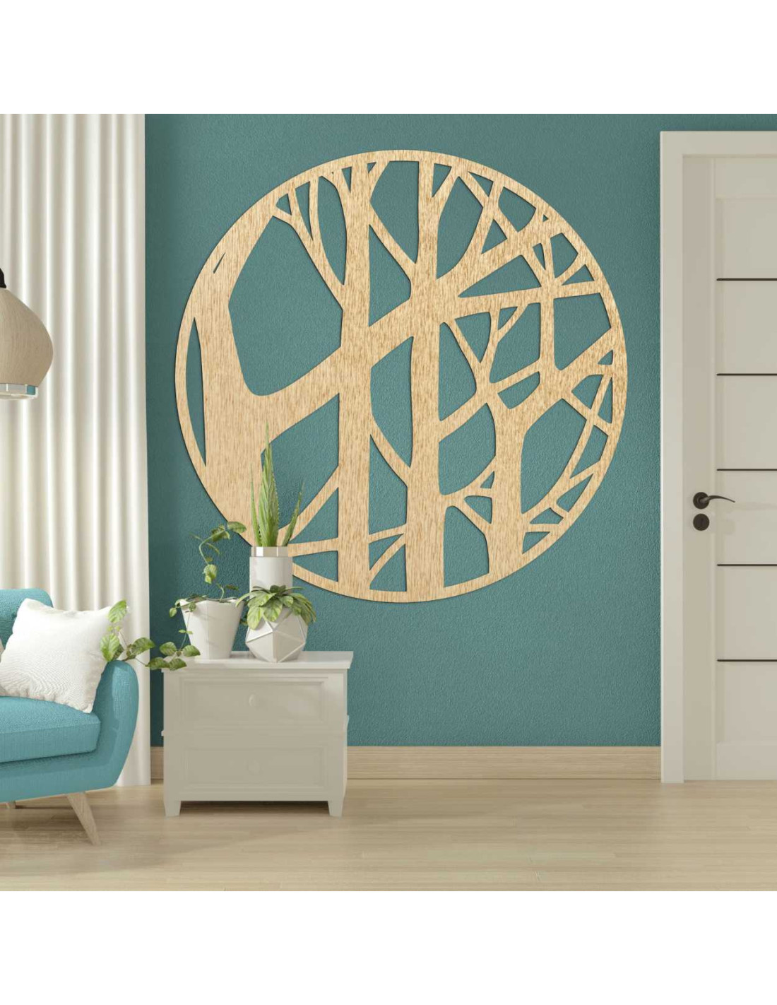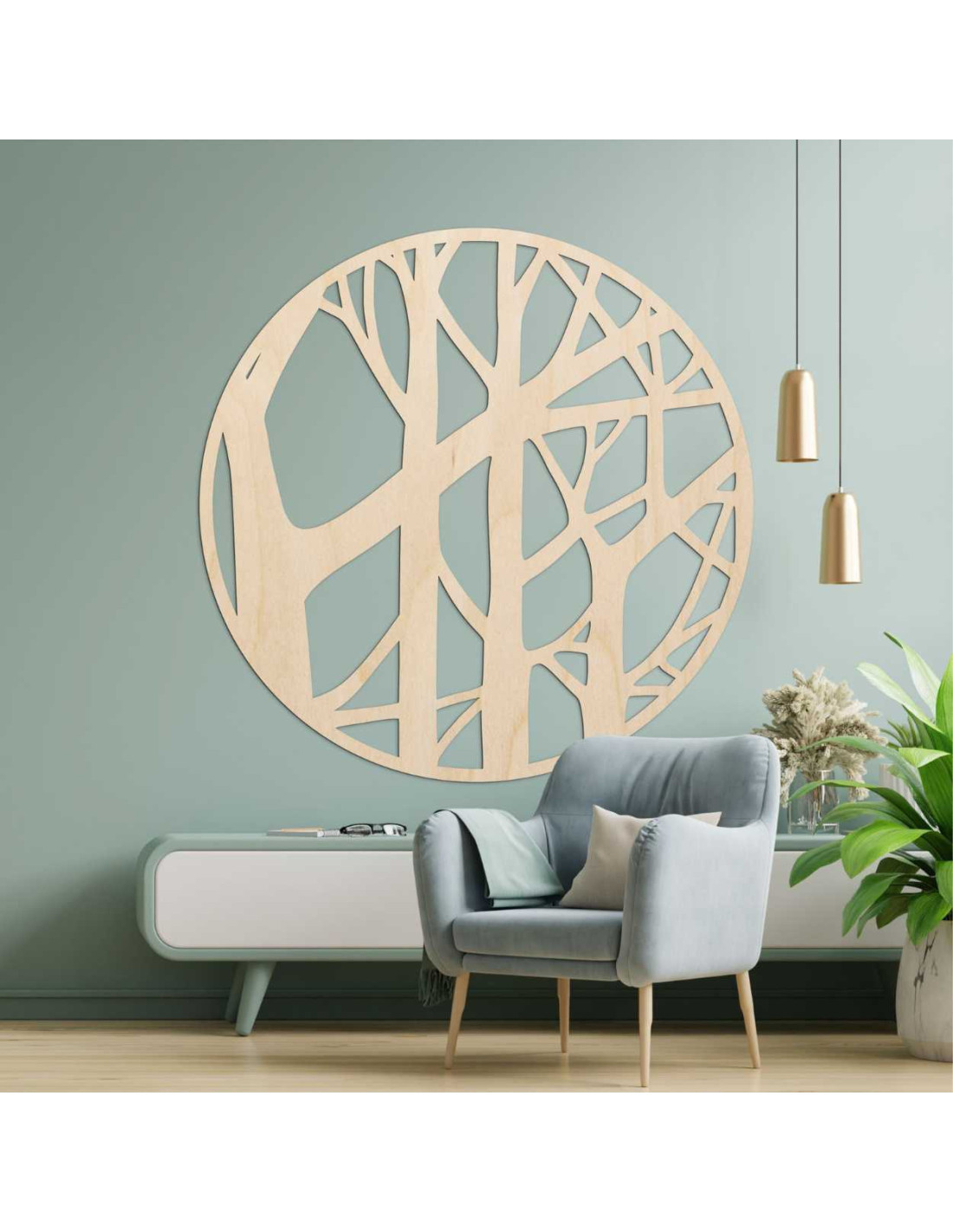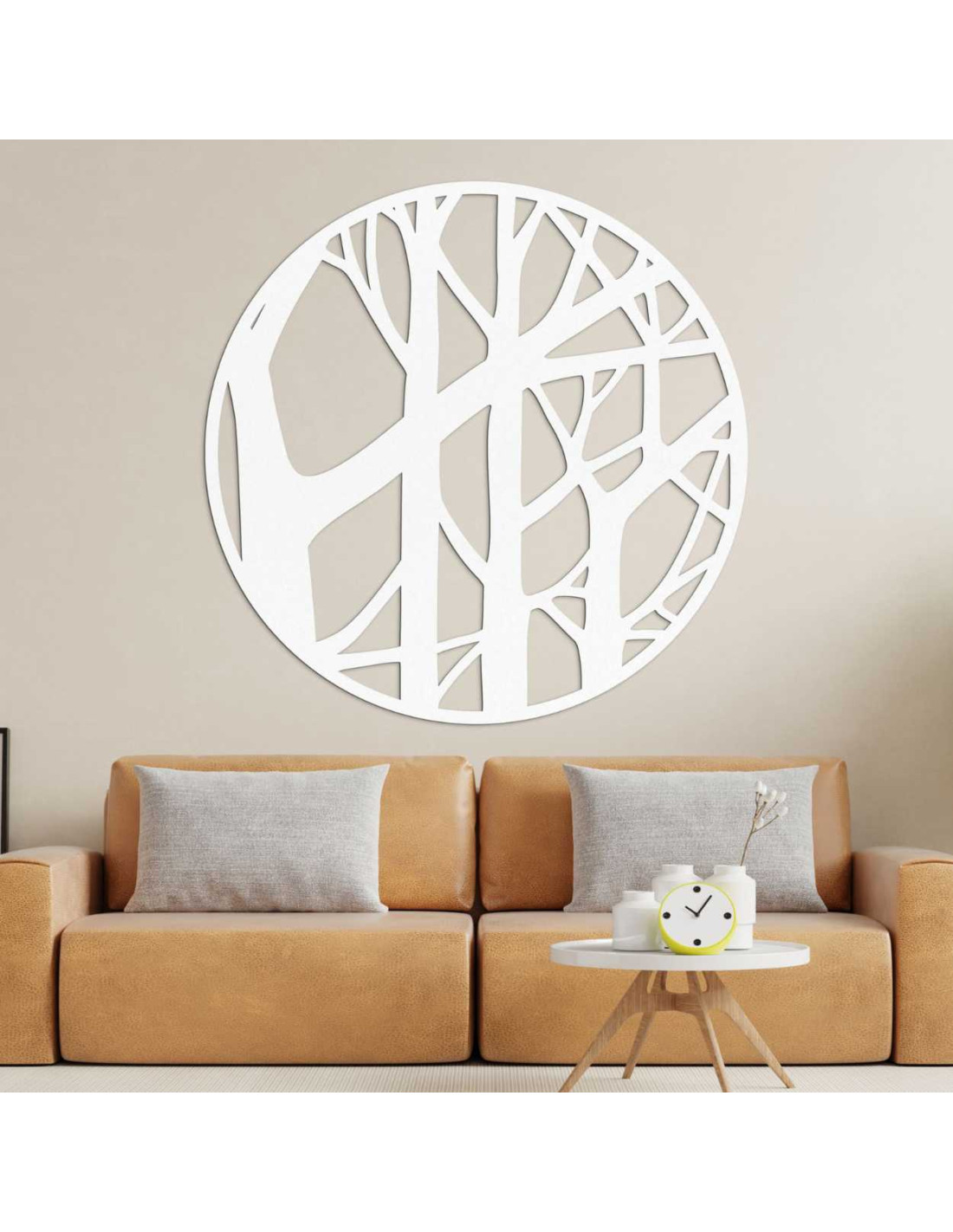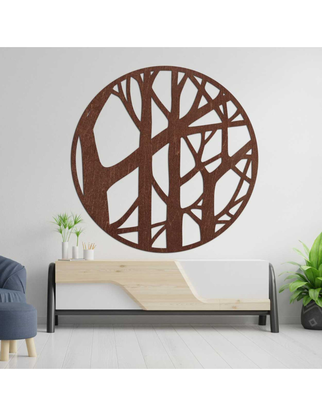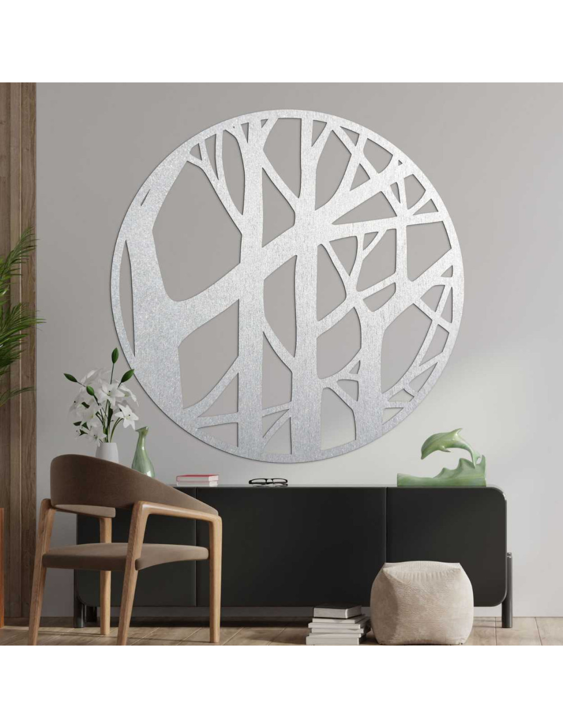 Motiv stromů v kruhovém rámu působí elegantně, ale zároveň přirozeně a uvolněně.