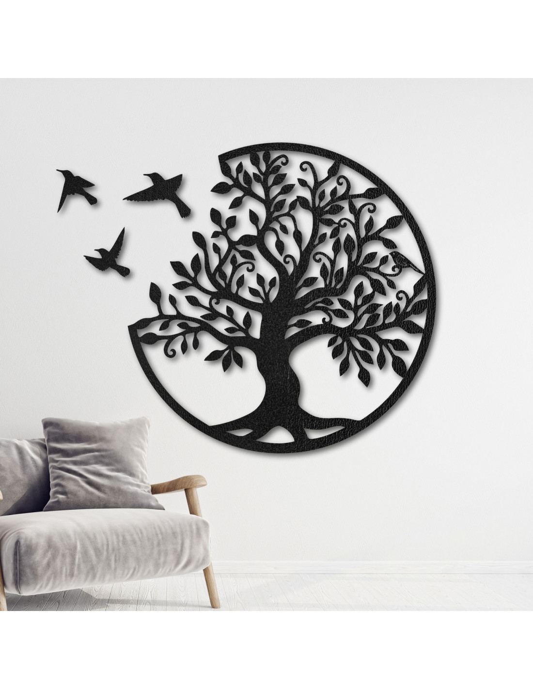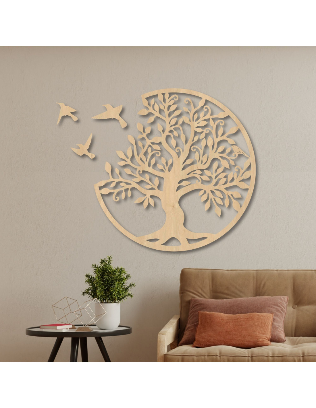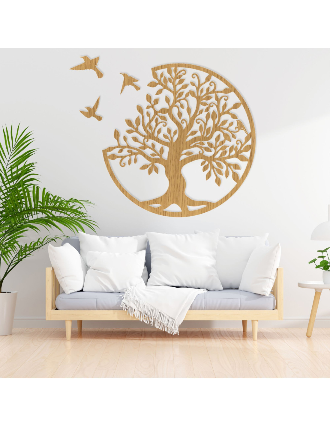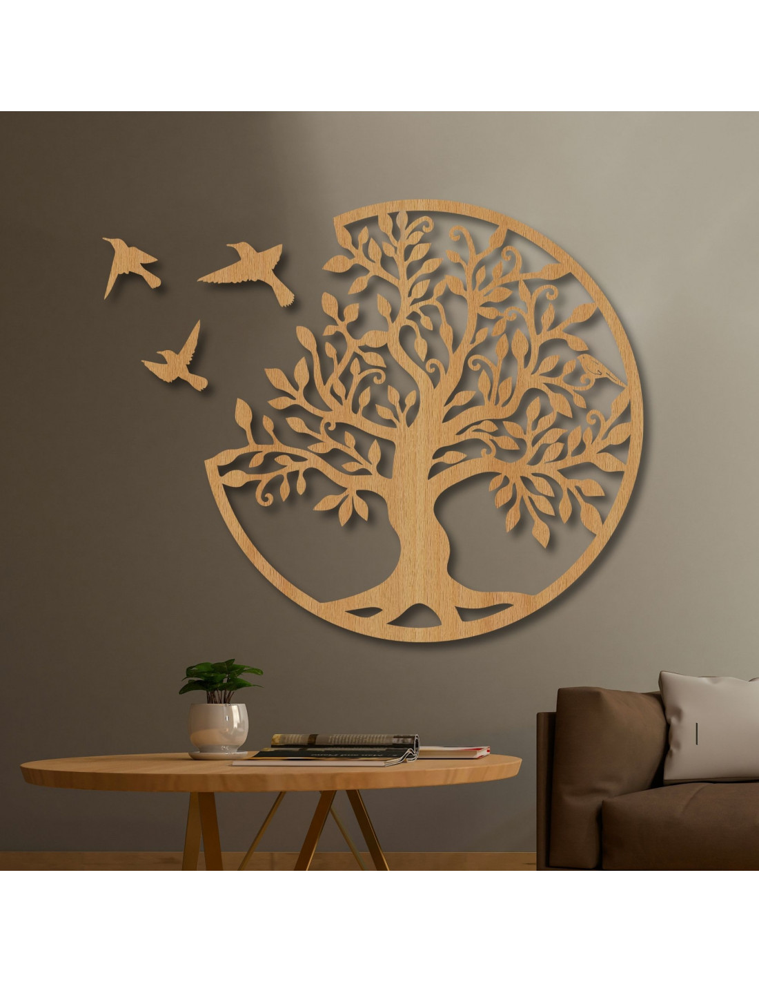 Elegantní dřevěná dekorace na zeď ve tvaru stromu života s ptáky přináší do domova harmonii a přírodní krásu. Tento unikátní designový obraz z překližky je vyřezáván precizní laserovou technologií a následně ručně dokončován pro dokonalý vzhled a vysokou kvalitu povrchové úpravy.