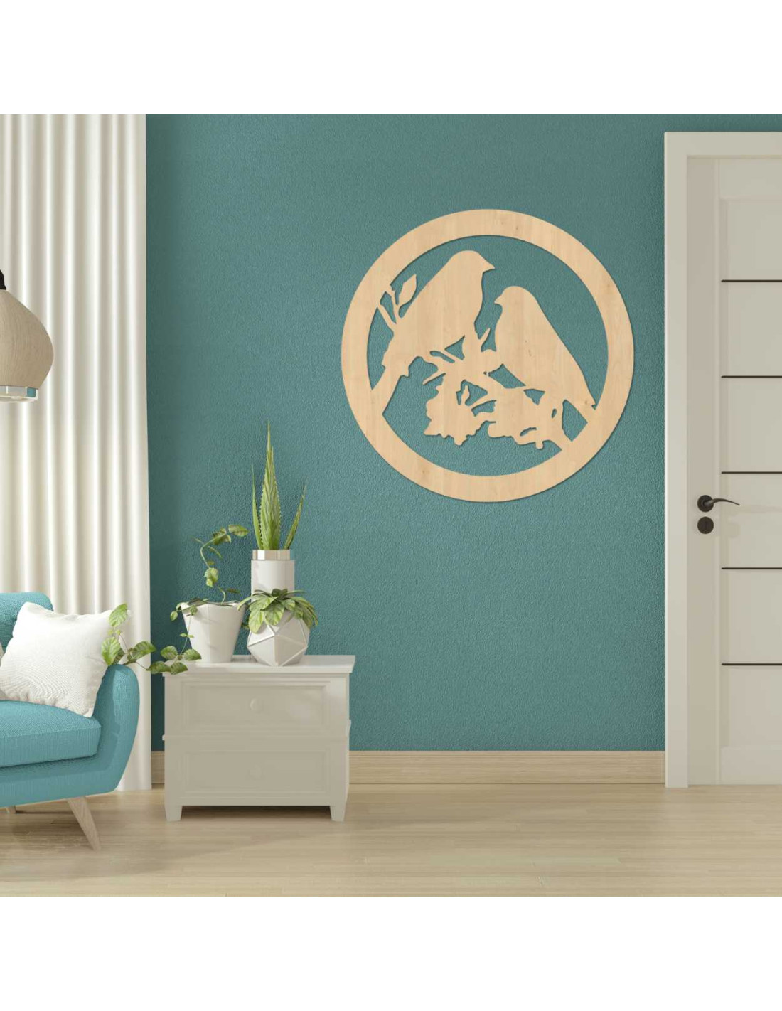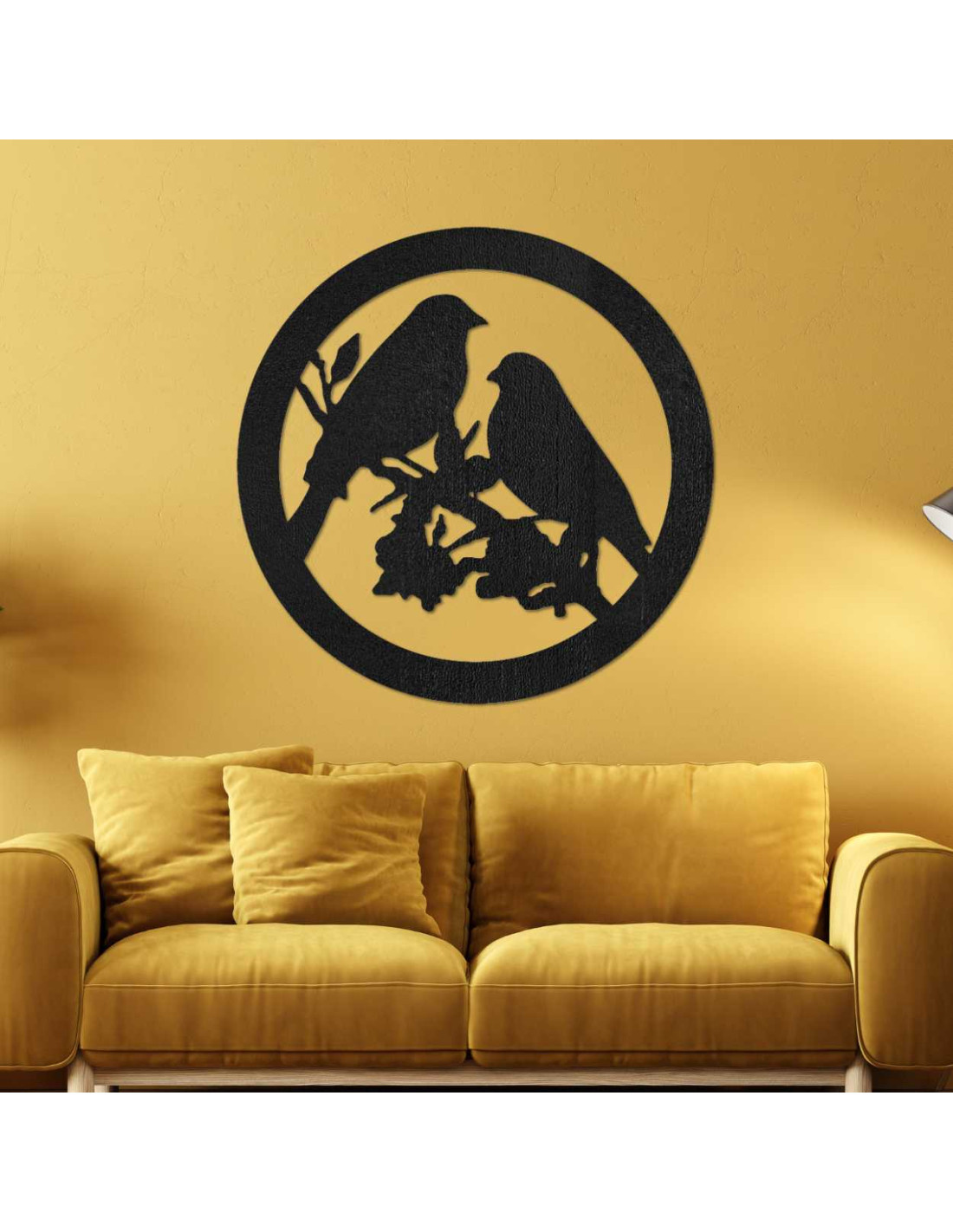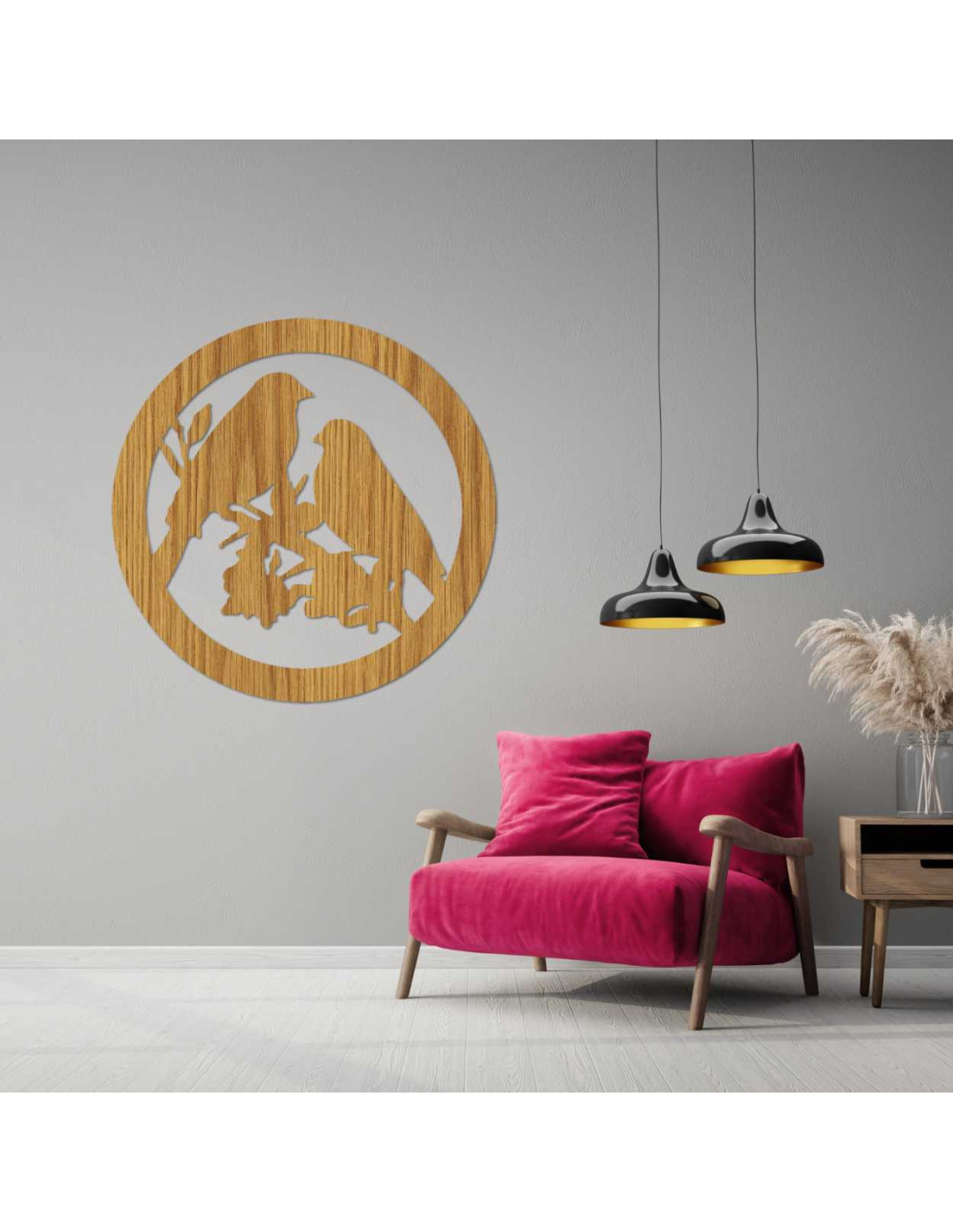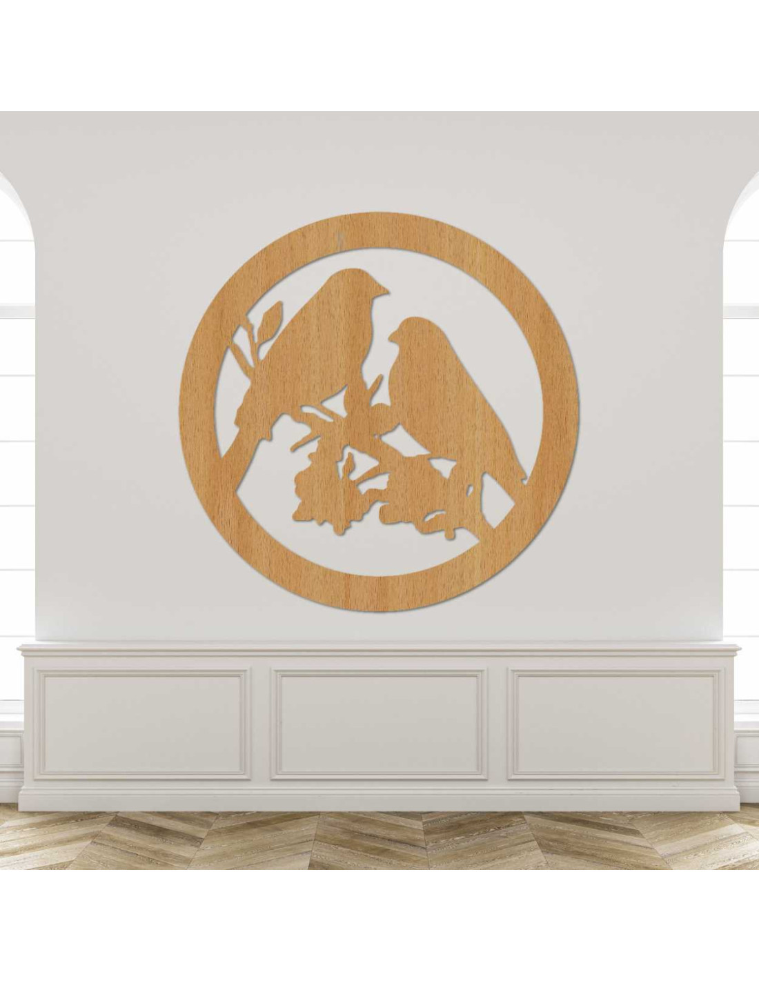 Dekorativní malba s motivem dvou ptáků na větvi v kruhovém provedení vyzařuje jemnost a přirozený půvab.
