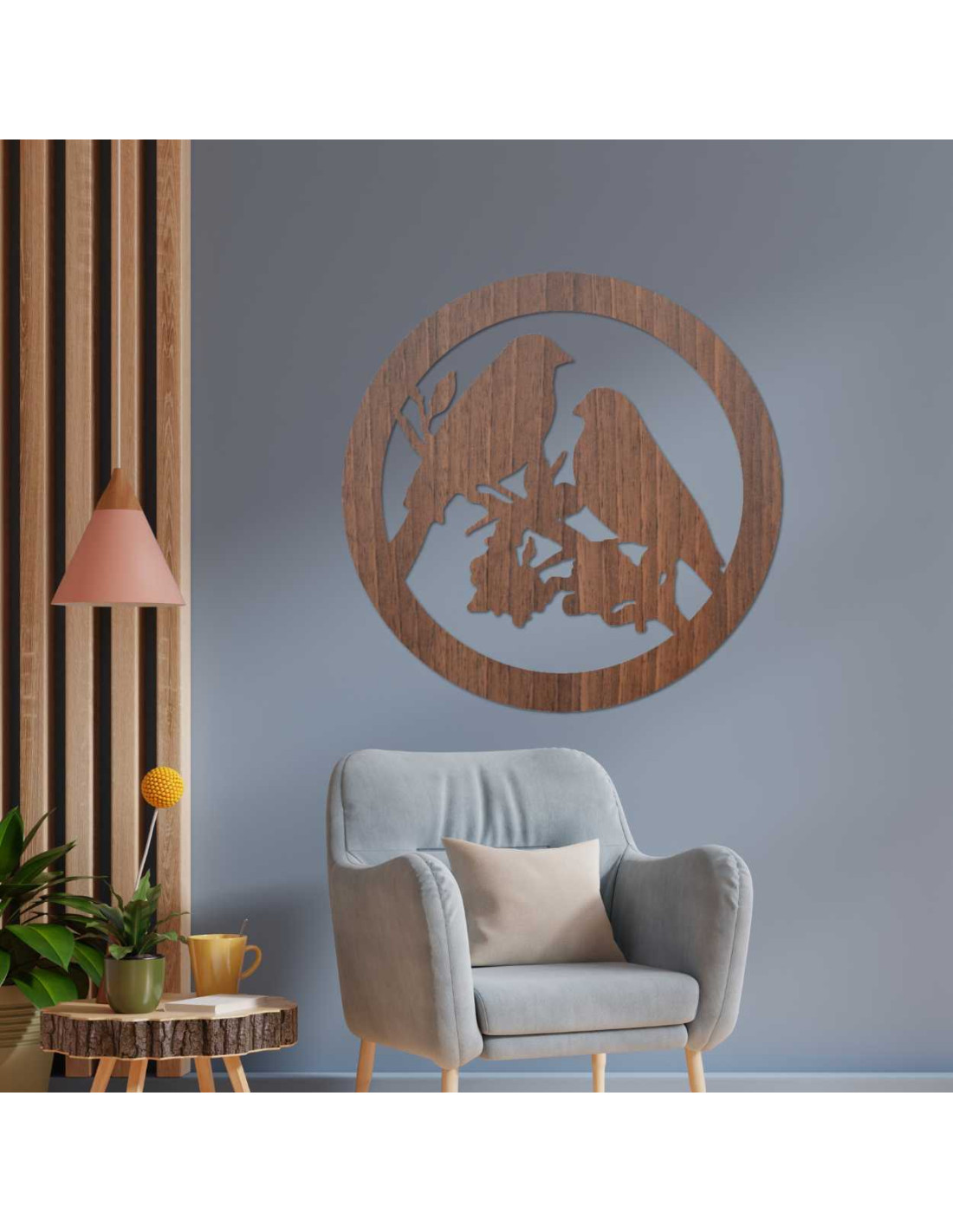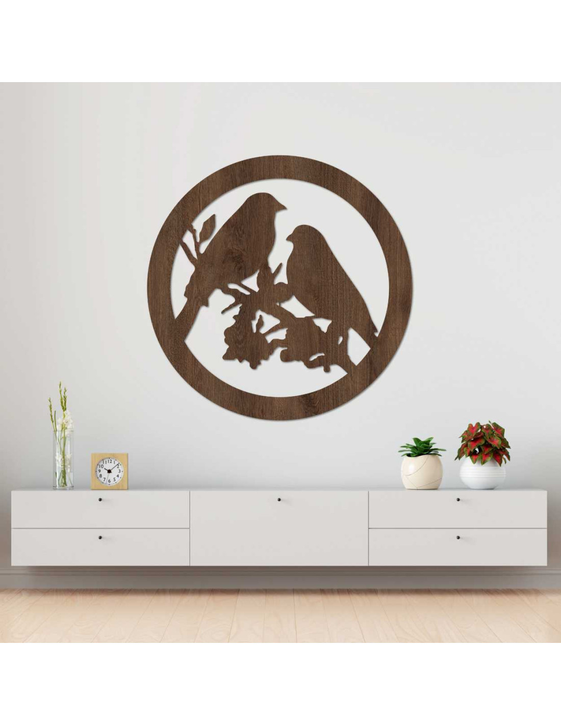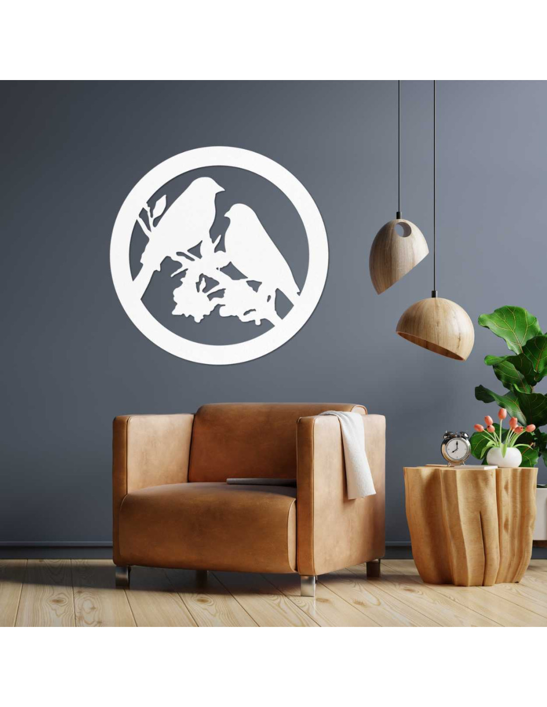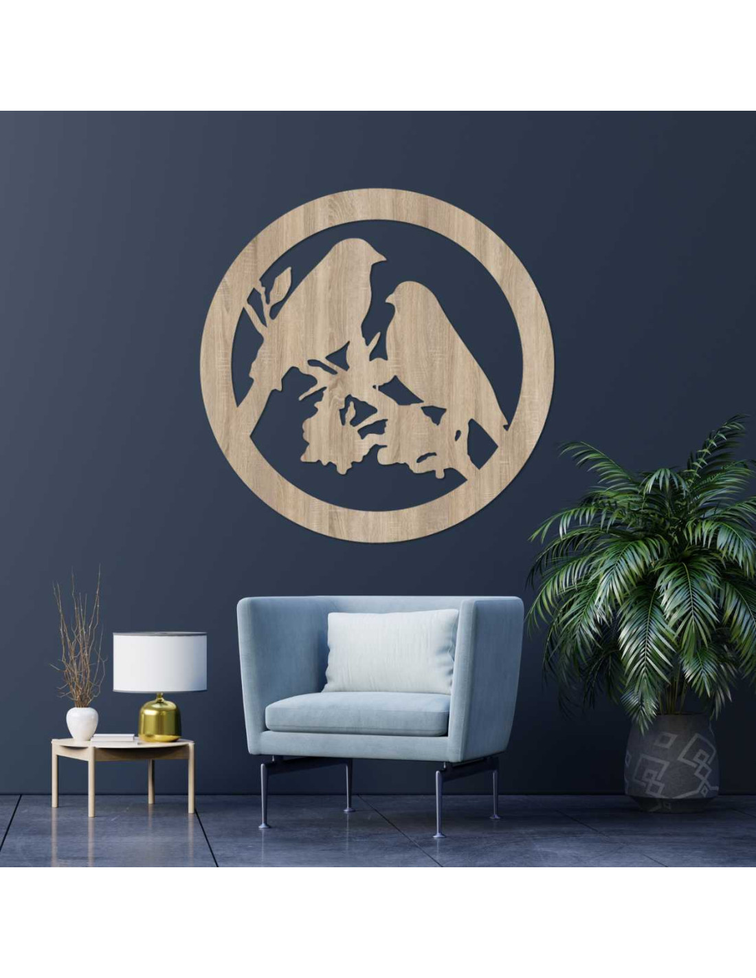 Dekorativní malba s motivem dvou ptáků na větvi v kruhovém provedení vyzařuje jemnost a přirozený půvab.