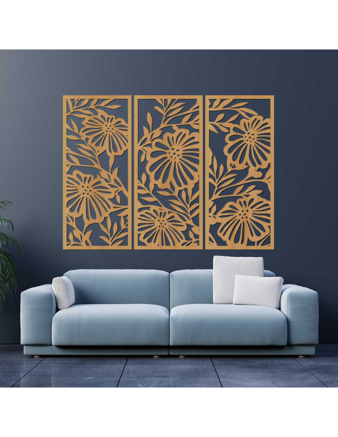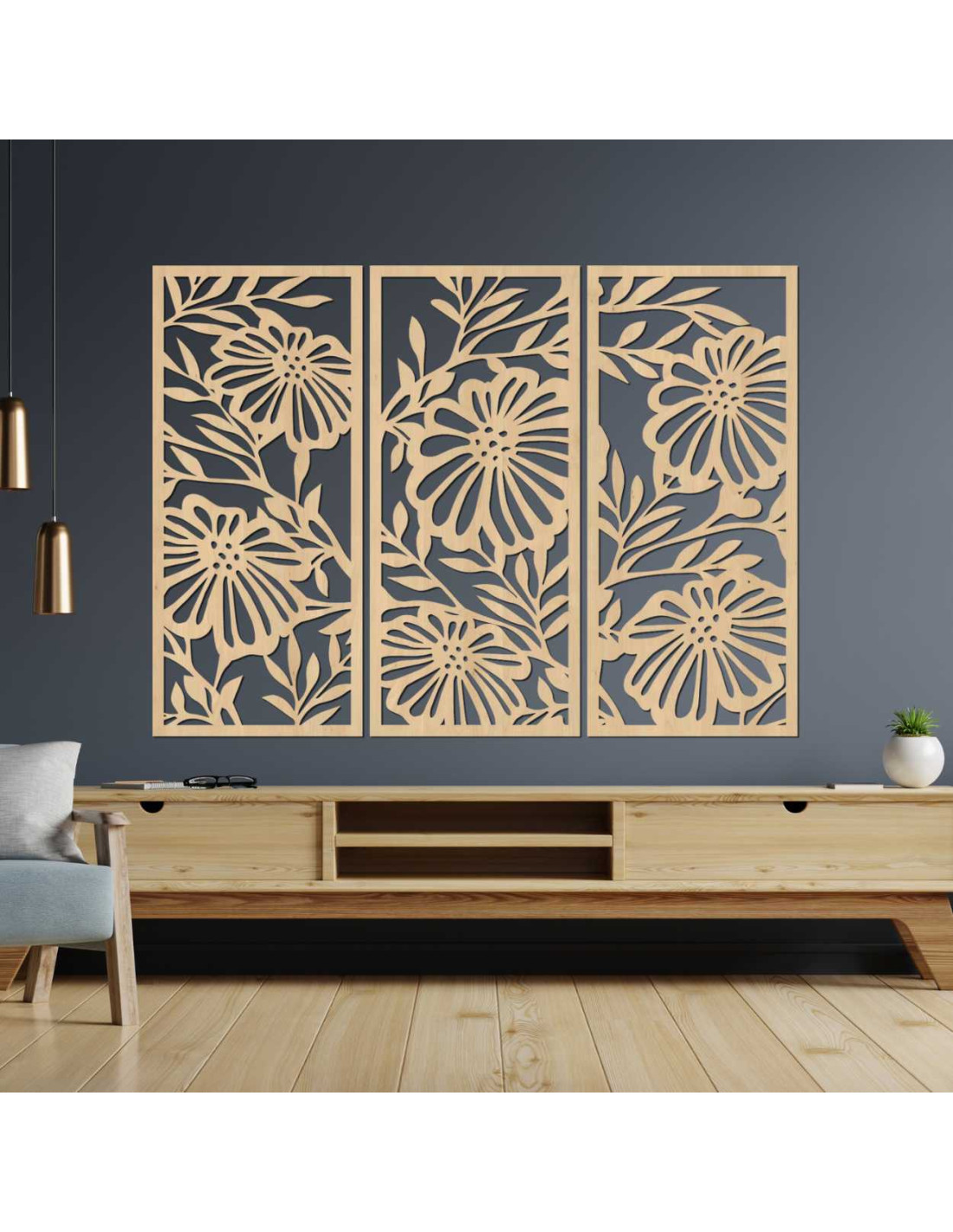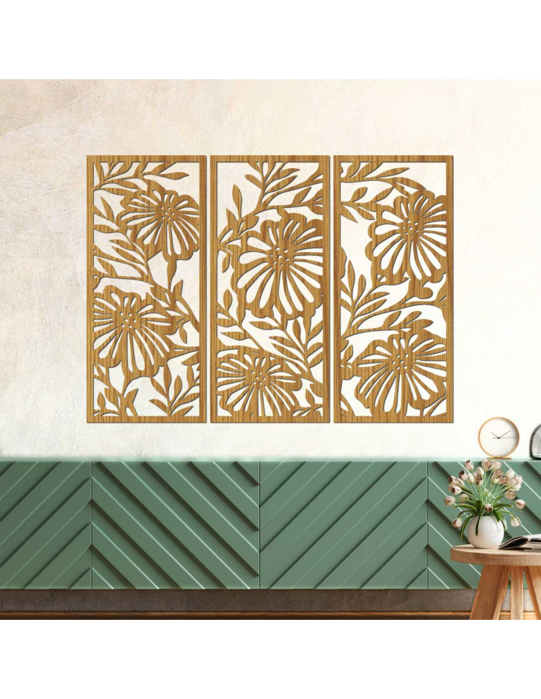 Dřevěný nástěnný obraz s květinovým vzorem vyniká detailním zpracováním a moderním třídílným designem.