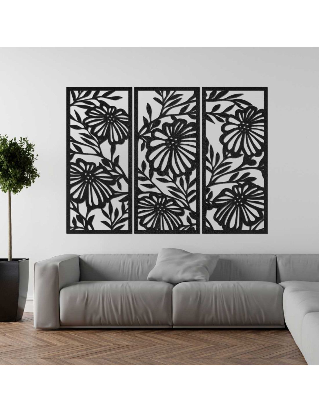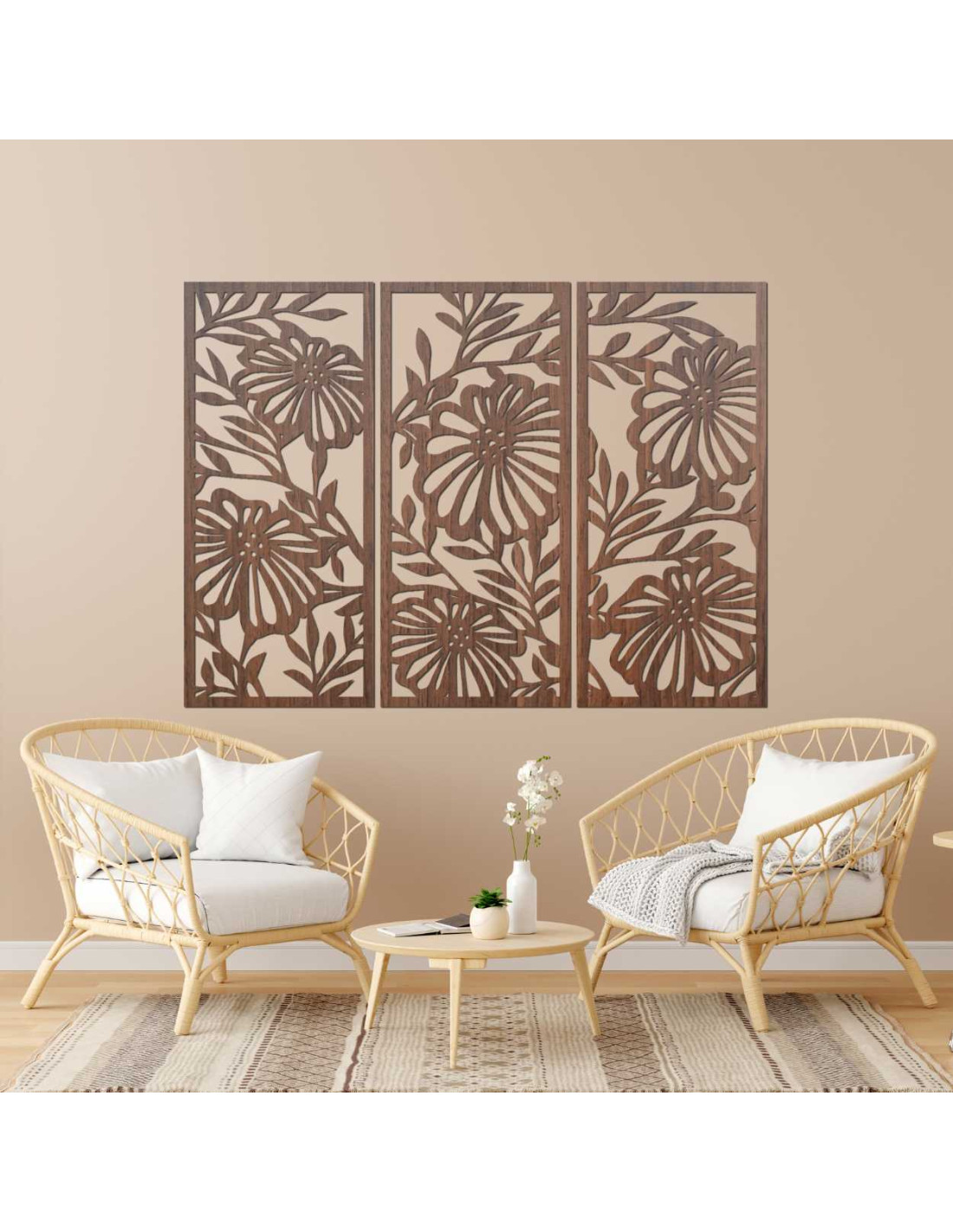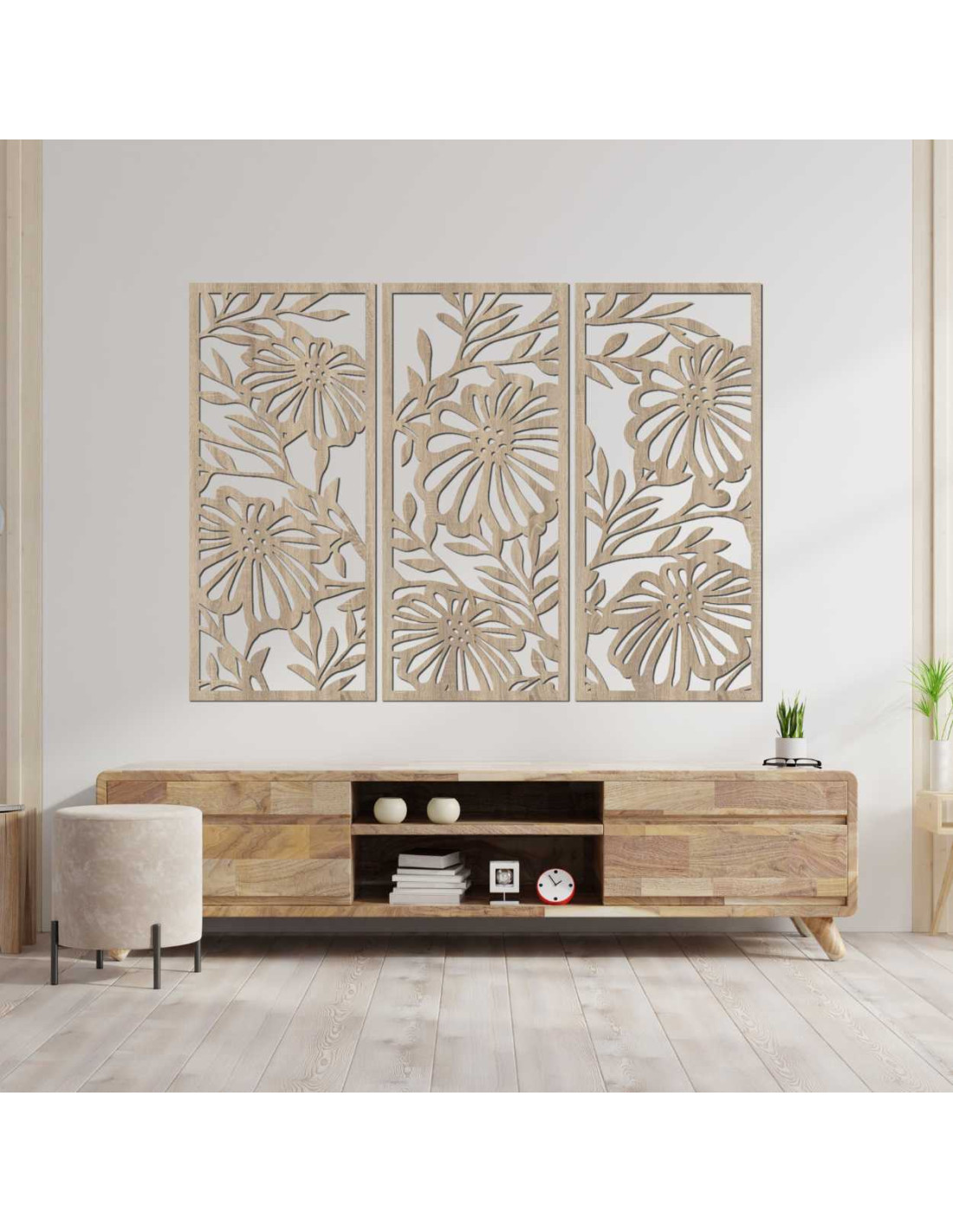 Dřevěný nástěnný obraz s květinovým vzorem vyniká detailním zpracováním a moderním třídílným designem.