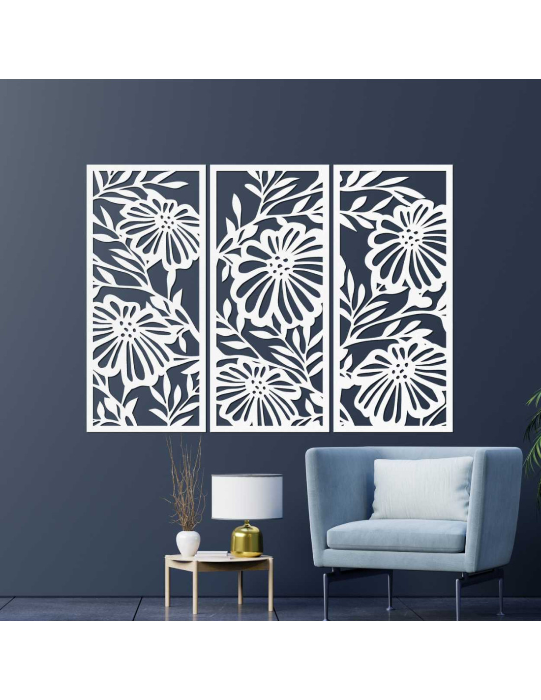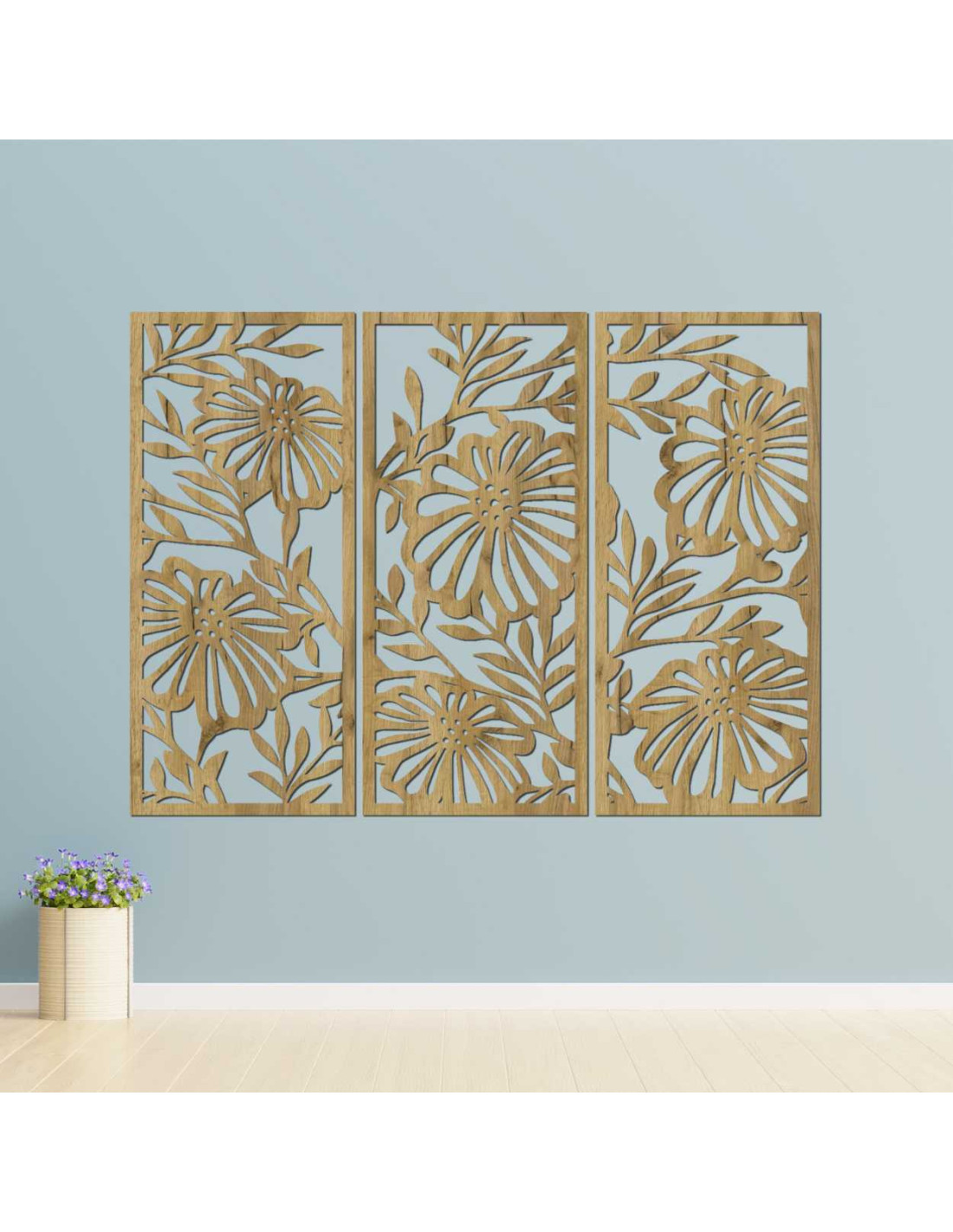 Umělecký dřevěný obraz s trojicí vertikálních panelů a květinovým designem.