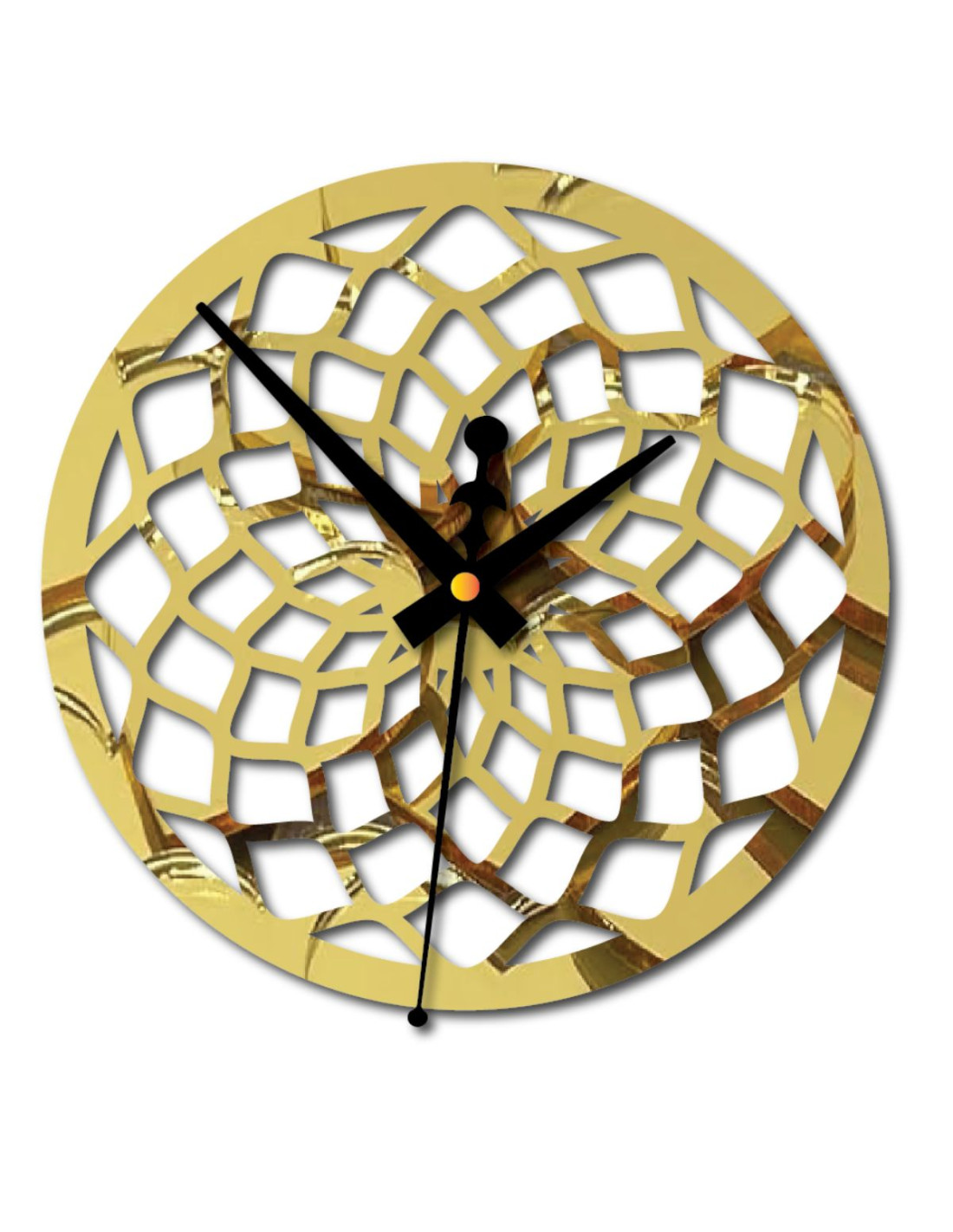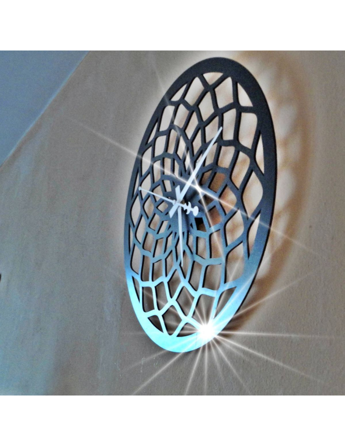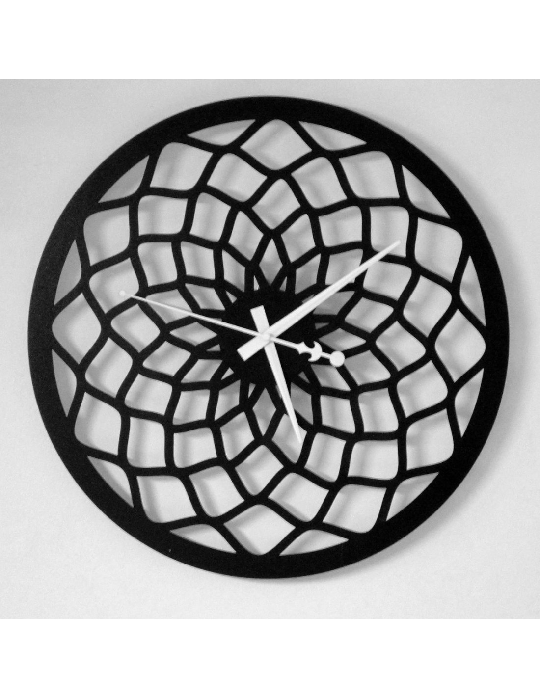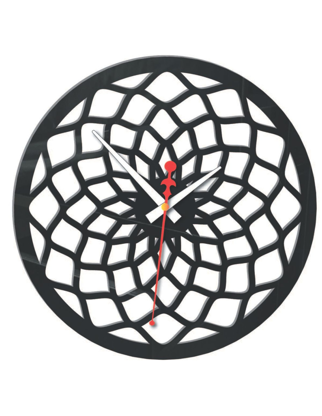 Hodiny mají výrazný vzor, který připomíná abstraktní mřížku nebo tvarované paprsky, čímž se stávají výrazným dekorativním prvkem v každém interiéru.