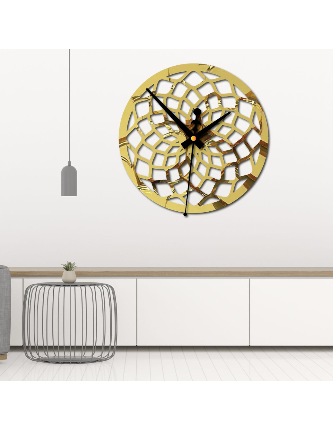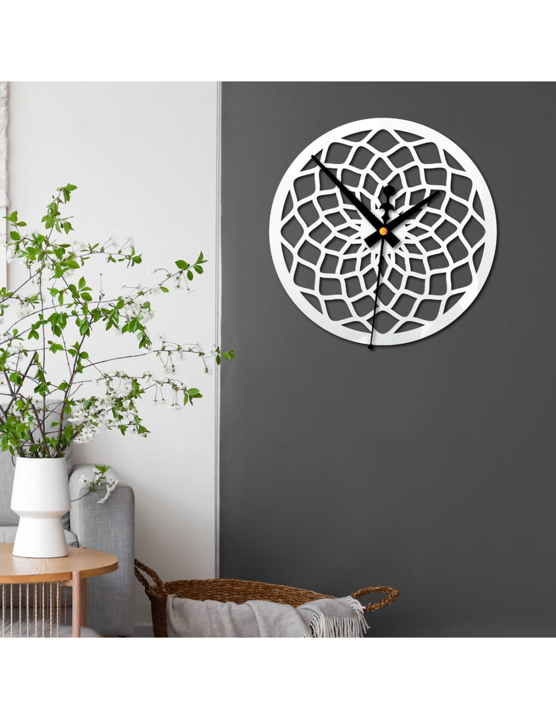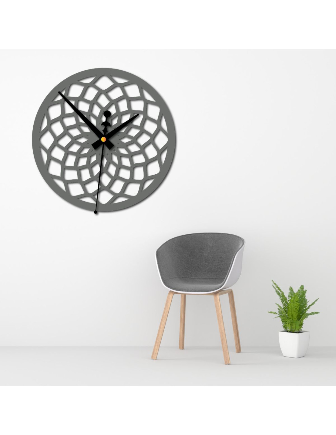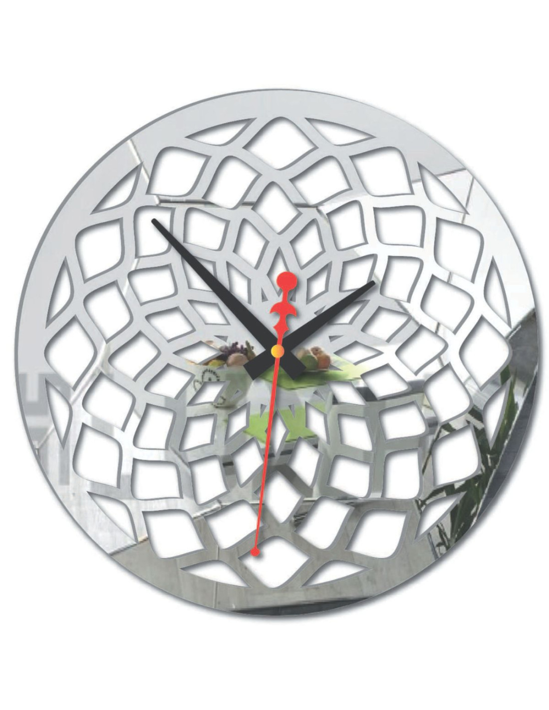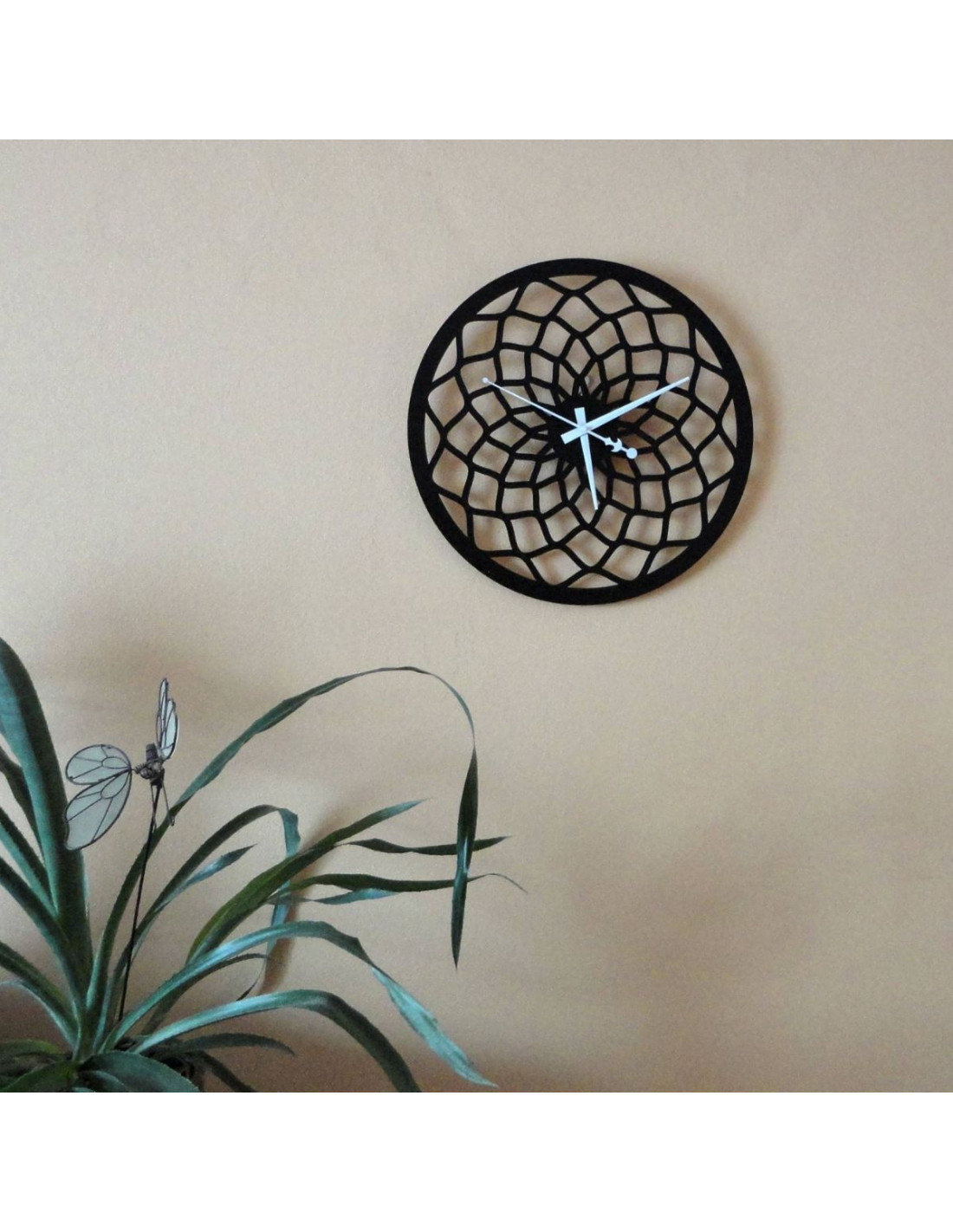 Hodiny mají výrazný vzor, který připomíná abstraktní mřížku nebo tvarované paprsky, čímž se stávají výrazným dekorativním prvkem v každém interiéru.